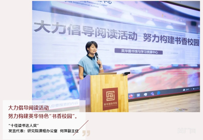“阅读是潜移默化的滋养”英华图书馆与学习资源中心何萍老师以“品质英华、美丽英华、智慧英华、幸福英华”四个战略维度为原点,以学生阅读观、教师阅读观、家长阅读观、学校阅读观四个层次,阐释英华特色的“书香校园”的构建过程。她希望通过大家的共同努力,让阅读成为英华人的生活方式,让阅读成为全校师生共同追求的主要精神源泉,让阅读成为教育的主导力量。