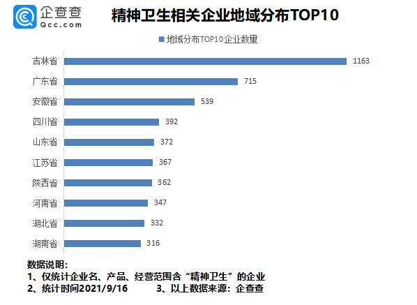 精神卫生相关企业省份分布:吉林企业最多,其次是广东、安徽等省