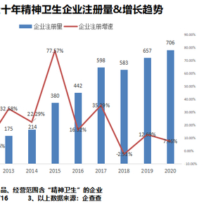 目前我国现存“精神卫生”相关企业共7824家,近10年来,精神卫生相关企业注册量整体呈逐年上升趋势,2020年新增706家,同比增长7.46%。