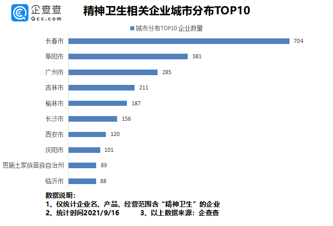 精神卫生相关企业城市分布:长春最多,其次是阜阳、广州等市