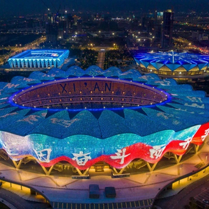 西安奥体中心主体育场是西北地区唯一一座6万座以上的体育场,是举行全运会开幕式、田径比赛以及残奥会等相关赛事的主会场,造型以西安市花“石榴花”为设计灵感,寓意“盛世之花、丝路起航”,建筑面积约为15.2万平方米,外轮廓直径334米,建筑高度58.3米,采用大空间管桁架屋面,五层钢筋混凝土框架结构,28个巨型V型柱支撑起28个巨型花瓣,呈现出一朵巨大的钢铁石榴花。