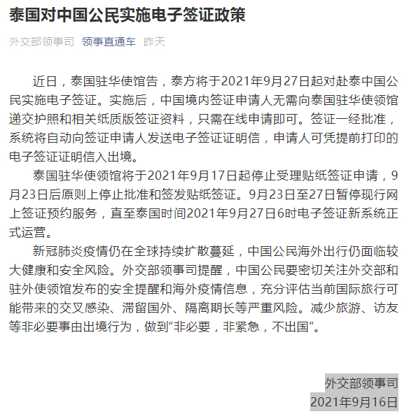 16日,领事直通车在其微信公众号中发布消息称,近日,泰国驻华使馆告,泰方将于2021年9月27日起对赴泰中国公民实施电子签证。实施后,中国境内签证申请人无需向泰国驻华使领馆递交护照和相关纸质版签证资料,只需在线申请即可。签证一经批准,系统将自动向签证申请人发送电子签证证明信,申请人可凭提前打印的电子签证证明信入出境。