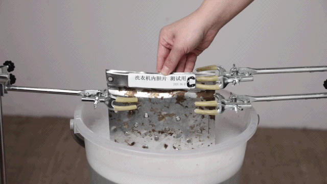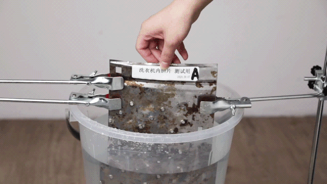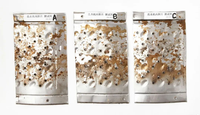 上面这三块,是品牌方特意买了一台二手洗衣机,将不锈钢内筒切成了相同大小的切片,用来演示(以上均为真实污渍)。