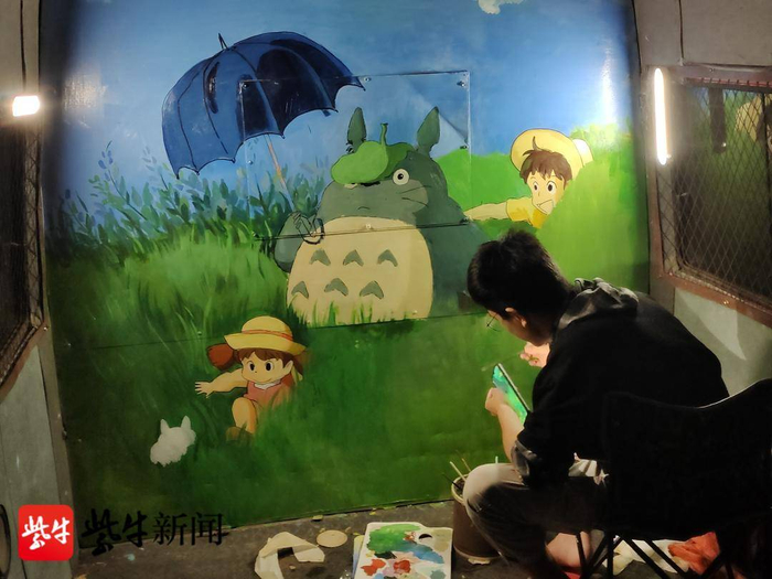 在车厢内一端的墙壁上,一只体态肥硕、憨态可掬的龙猫正头顶荷叶、打着雨伞和两个小女孩一同站在草地上,这是宫崎骏执导动画电影里《龙猫》中的一个场景。在车厢两侧窗户上端,能看到千与千寻、天空之城等其他宫崎骏动画中的熟悉角色。
