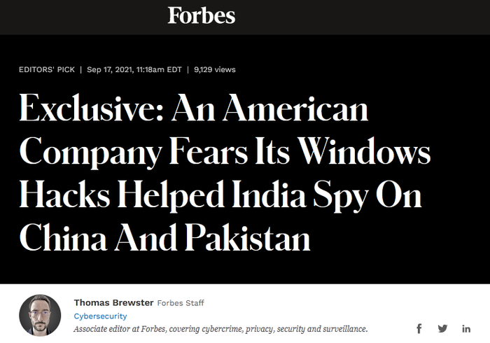【原标题】恶意满满!美媒:印度曾利用美公司黑客技术监听中国和巴基斯坦来源 | 环球网编辑 | 贾雨沁