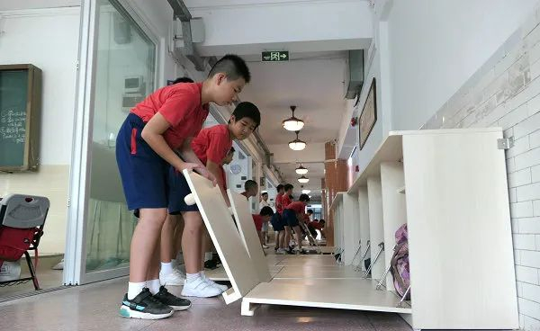 1.在走廊和课室墙边定制折叠床板收纳柜,解决学生平躺午休的需求。