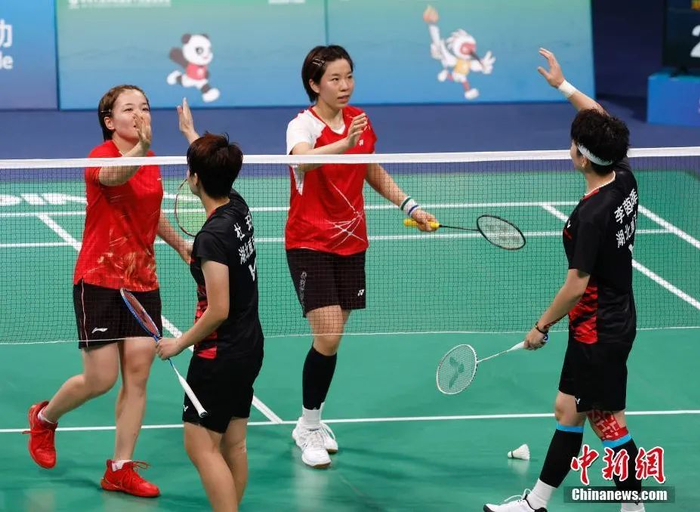 9月17日,在西安举行的第十四届全运会羽毛球女子双打决赛中,联合队选手贾一凡(左三)、陈清晨(左一)以2比0的总比分战胜湖北队选手李茵晖、杜玥,获得冠军。中新社记者 毛建军 摄