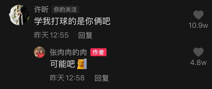 在近期一段爆火的视频中,东京奥运会跳水女子双人10米跳台冠军陈芋汐和张家齐在训练之余模仿起了国乒运动员许昕的击球姿势。而当张家齐之后在社交媒体发布视频时,许昕“拍马赶到”留言:“学我打球的是你俩吧”。