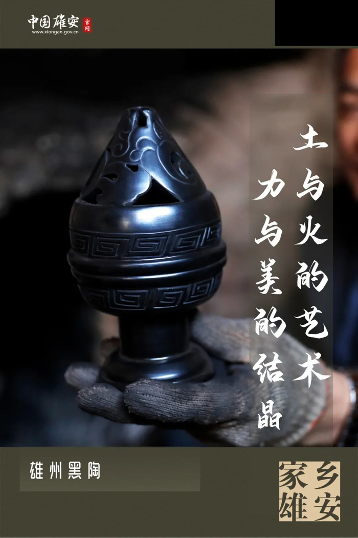 雄州黑陶被誉为“土与火的艺术,力与美的结晶”,采用雄安特有的纯净细腻的红胶土,经过手工拉坯成型、晾晒、轧光、画线、雕花以及烧结等多道工艺程序,制作成仿古、仿青铜器、高轧光、镂刻、彩绘等多种系列的黑陶工艺品,不仅保留着千年古艺的特色,还具备“质地细腻、古朴典雅、色如墨玉、声如钟磬”的新特征。