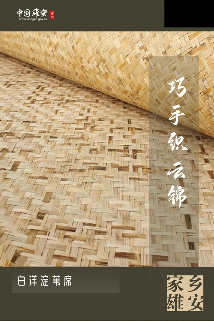 白洋淀苇编是淀区世代传承的古老手艺。勤劳聪慧的淀区人民利用芦苇编织成品种繁多、形态各异、用途不一的苇席,如炕席、苦垫席、囤席、包装席等,包括平纹、彩纹、回纹、桌面纹、人字纹等多种样式,颇受人们青睐。随着时代的变迁,家家编席忙的场景已淡出了人们的生活,但是这项颇具白洋淀水乡风情、自然古朴的技艺,记录了白洋淀的沧桑,守住了白洋淀人的记忆。