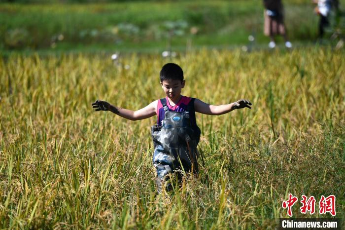 9月19日,成都一景区里的稻田抓鱼活动吸引游客参与。当日是2021年中秋节小长假首日,民众纷纷走到户外享受野趣生活。