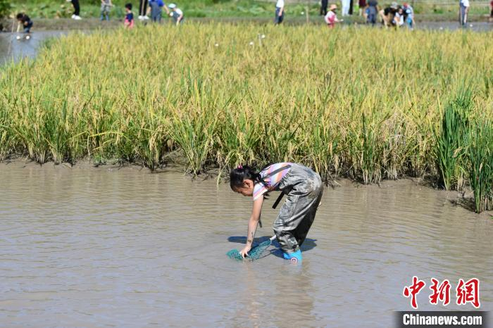 原标题:成都:游客稻田抓鱼享受中秋野趣生活