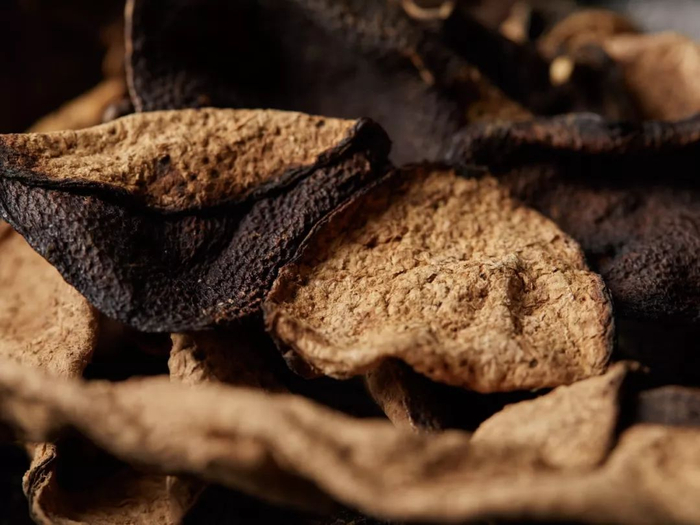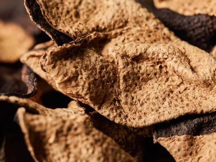 陈化后的陈皮,内表皮原来白色的丝络会陈化脱囊,变成陈旧的黄色。