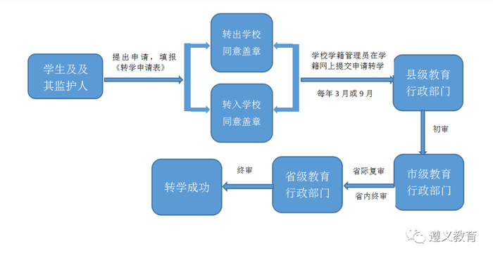 学生原则上不得转学,确因特殊原因确需转学的,同级学校可互转。学生及其家长或法定监护人向学校提出申请,如实填写《贵州省普通高中学生转学申请表》相关内容后经转出、转入学校同意盖章,由转入(出)学校在学籍系统申请网上办理,县级教育行政部门初审后,经市级教育行政部门审查核办。