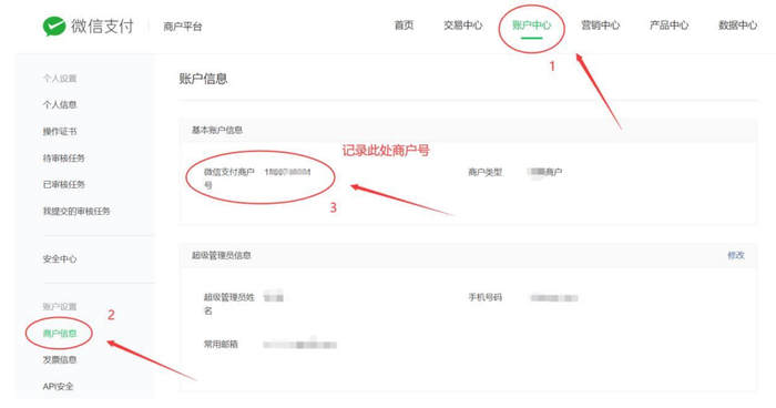 2. 若您通过“微信收款商业版“小程序申请的商户号,请点击“管理与设置”公司名 称下方查看商户号。