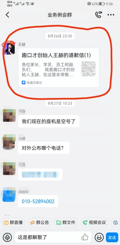 8月26日,赵宇在业务例会群看到了王赫准备发布的道歉信版本,打开后,里面的编辑日期显示“8月24日”。也就是说,这封道歉信至少在趣口才倒闭的三天前就写好了。