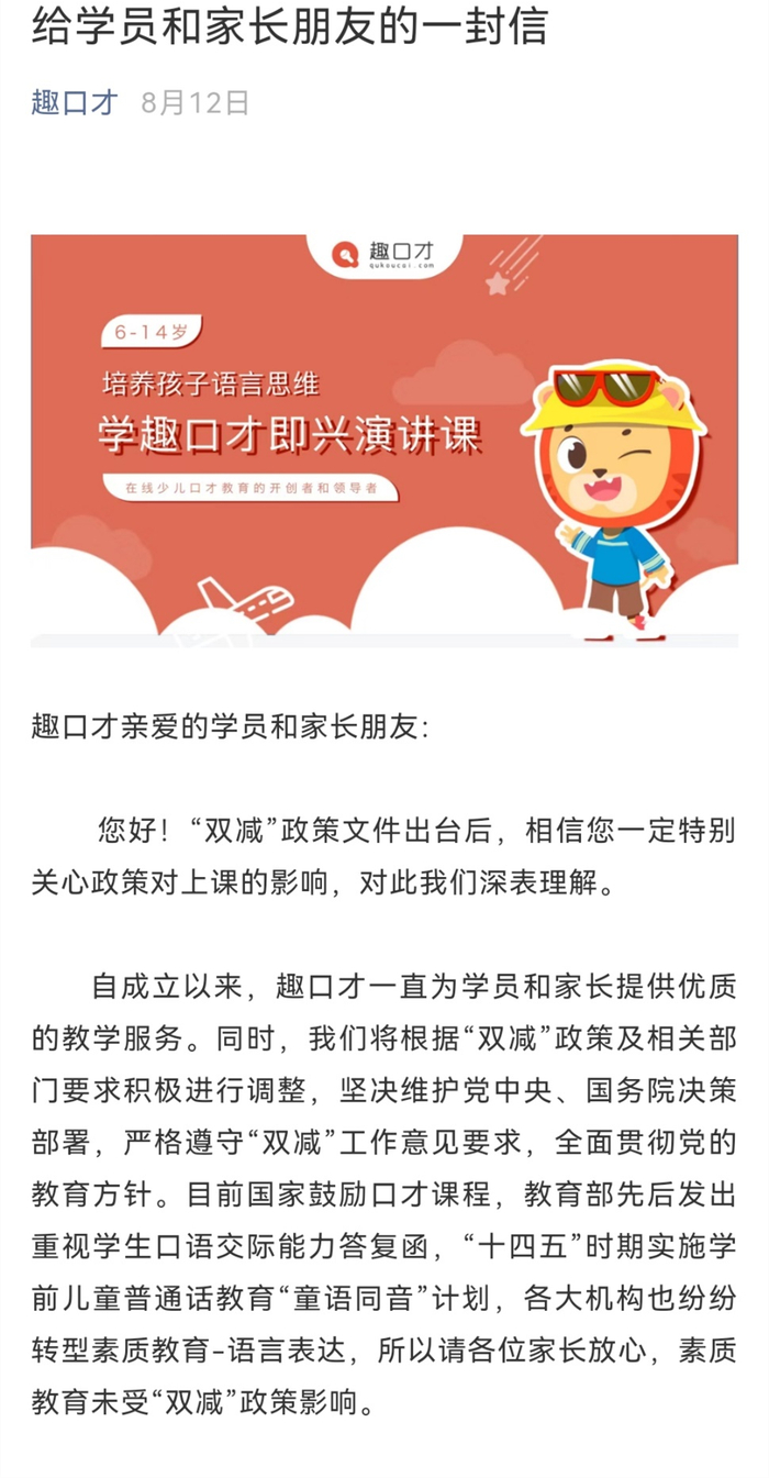 然而,趣口才在8月12日时告知家长,素质教育培训并不直接受“双减”影响。“各大机构也纷纷转型素质教育-语言表达,所以请各位家长放心,素质教育未受‘双减’政策影响。”