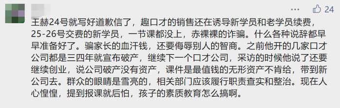 虽然深受家长们质疑,但8月29日,创始人王赫在“趣口才”公众号中称“绝不跑路”。