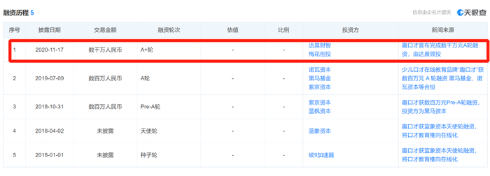 资料显示,趣口才最新的一轮融资在去年底。彼时其宣布完成了由达晨领投的数千万元A轮融资。至此,趣口才共有5笔融资,投资方包括碳9加速器、蓝象资本、黑马基金、诺瓦资本、紫京资本等。