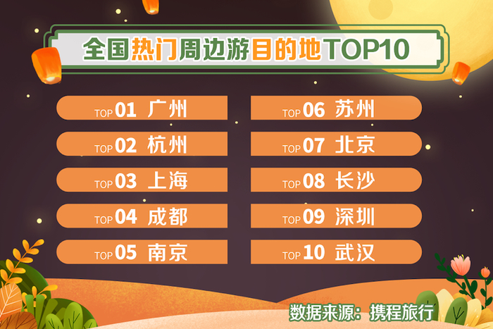 今年中秋,最热门的周边游目的地多数集中在华东、华南地区,前十位分别为:广州、杭州、上海、成都、南京、苏州、北京、长沙、深圳、武汉。