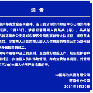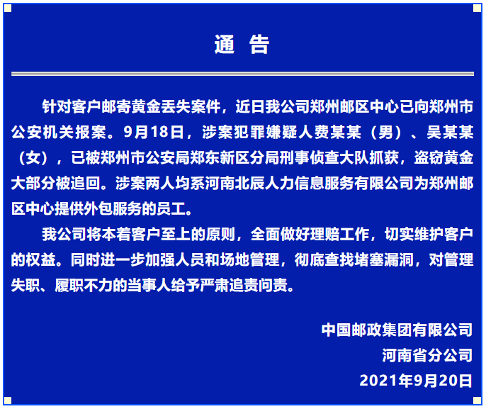 据“河南邮政”微信公号9月20日消息,针对客户邮寄黄金丢失案件,近日公司郑州邮区中心已向郑州市公安机关报案。9月18日,涉案犯罪嫌疑人费某某(男)、吴某某(女),已被郑州市公安局郑东新区分局刑事侦查大队抓获,盗窃黄金大部分被追回。涉案两人均系河南北辰人力信息服务有限公司为郑州邮区中心提供外包服务的员工。