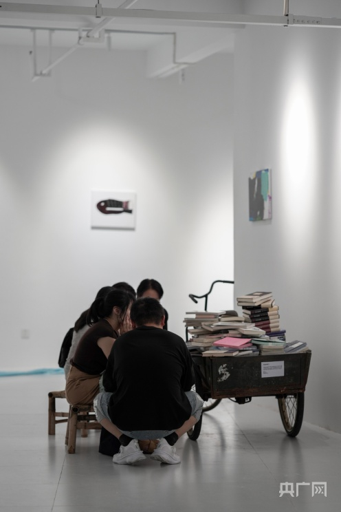 展厅中有一辆旧三轮车,载满书籍,一旁摆放四、五把农村常见的矮竹椅,标签题名《去乡村》。作者吴冬日,网名“二狗”,在韩岭开着鲤朵书店。近年他特别关注乡村振兴,关注书店与乡村的结合,尤其热衷讨论年轻人去乡村工作与生活的可能性。现场不少观众,很自然地坐到小竹椅上拿了三轮车上的书翻阅。这样的自然状态或许就是创作者想要的吧。