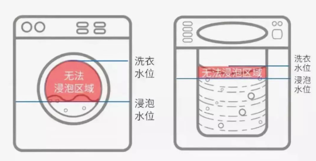 滚筒式洗衣机水位都很低,2/3的筒壁都无法浸泡,根本没法清洁。波轮式洗衣机,也会留下一截清洗死角。