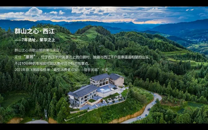 群山之心·西江店位于黔东南雷山县西江千户苗寨边上的白碧村。高踞于满山灯火之上,四周满眼是雷公山国家森林公园的美景。