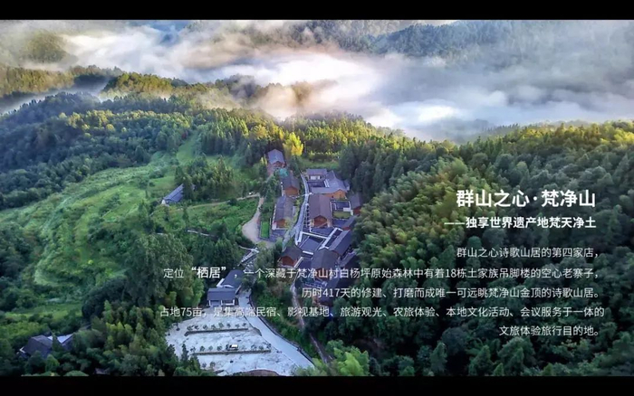 群山之心·梵净山店深藏于梵净山村白杨坪原始森林中,是一个有着18栋土家族吊脚楼的空心老寨子,也是唯一可远眺梵净山金顶的诗歌山居。