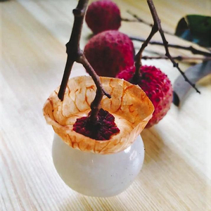 它像极了中国传统的宫灯造型,在阳光或灯光的映射下,半透明的果肉里,隐约可见那颗黑黑的核,让这没有光源的“灯”泛着一点儿光晕。