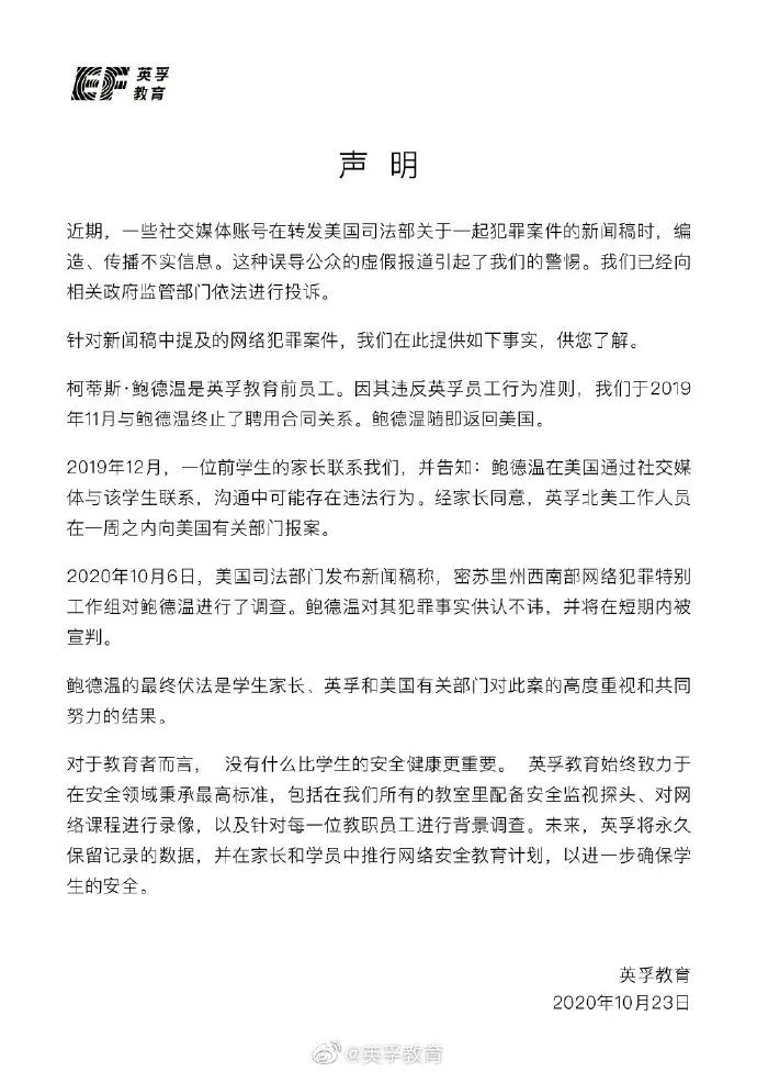 英孚教育官方微博(@英孚教育)2020年10月23日凌晨发布一则声明称,柯蒂斯·鲍德温确为英孚教育前员工,因其违反员工行为准则,该公司已于2019年11月与鲍德温终止了聘用合同关系,鲍德温随即返回美国。