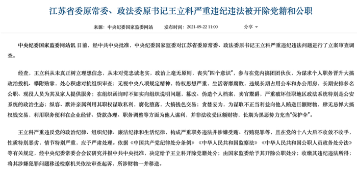 2021年9月22日,王立科被双开,有几个细节值得一提。