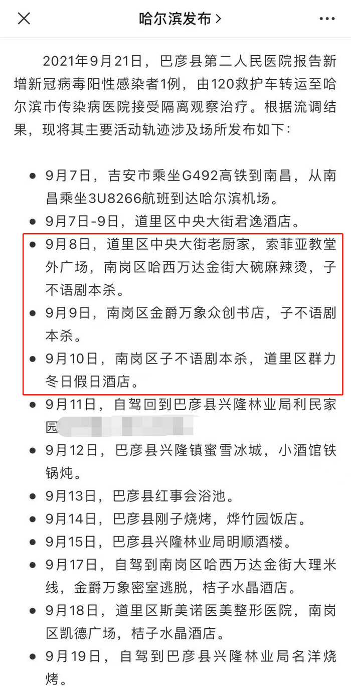 9月21日,哈尔滨公布了本轮疫情首个确诊病例的行程轨迹。值得注意的是,该感染者曾连续3天到一家剧本杀店游玩。