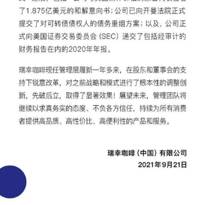 9月21日晚,瑞幸咖啡发布声明称公司已向开曼法院正式提交了对可转债债权人的债务重组方案,并且正式向美国证券交易委员会(SEC)递交了包括经审计的财务报告在内的2020年年报。
