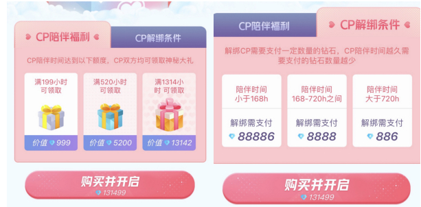 在以情感为底色的派单厅,CP就是一种可行且见效快的吸钱方式。在一些陪玩平台,如果老板要和某位陪陪绑定CP,需要花费1314元。官方介绍的玩法是随着陪伴时长的增长会返还部分金额,最多陪伴1314小时可返还1314元,如果想要解绑仍需付费,付费额随陪伴时间的增加而减少,陪伴小于168小时解绑需要888元,也就是说,如果是绑定后在168小时内再解绑需要2202元。