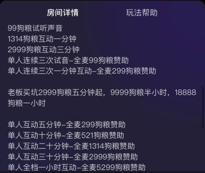 派单厅的定价通常由老板自己定,厅里只设置最低价格,可以要求陪陪一起陪玩游戏、陪聊天、陪看电影、唱歌等,声优厅点单的起步价通常在每小时几十元,但这只是最基础的消费,除此之外还有包厅、插队、打赏等服务。而在情感厅的价格更高,情感厅分为女频、男频,在这里用户会花钱让陪陪问自己问题或者互动玩游戏,13.14元可以被1个陪陪问3个问题或者互动1分钟,花费188元可以包走中意陪陪一小时,到小房间私聊。
