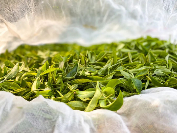 采摘后的茶叶要经过萎凋,先是日光萎凋2~3个小时,要根据经验,实时注意光照和温度的变化,调整遮阳罩的时间和幅度。