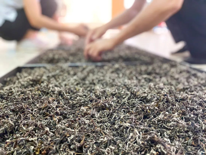 然后进行静置回润、揉捻、解块步骤,破坏茶叶细胞组织,让茶梗中的水分释放到叶片中,并把多余的水分挥发,冲泡时才有更多茶味。