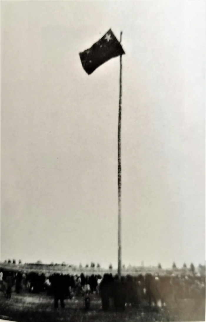 1949年10月7日,十九兵团官兵与市民在银川上空升起五星红旗。资料照片