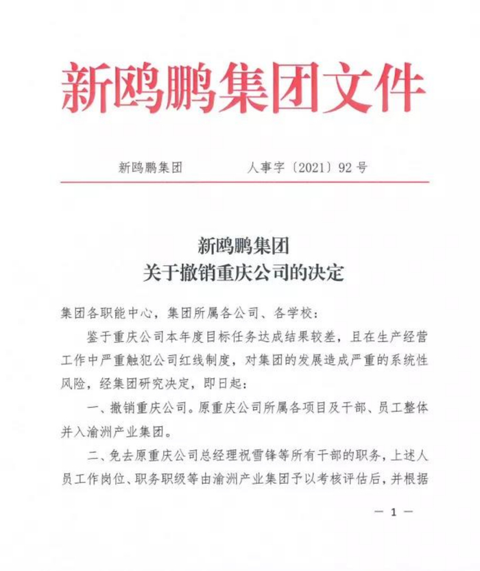 新鸥鹏集团撤销了重庆公司。9月22日,新鸥鹏集团发布了《关于撤销重庆公司的决定》,称鉴于重庆公司本年度目标任务达成结果较差,且在生产经营工作中严重触犯公司红线制度,对集团的发展造成严重的系统性风险,经集团研究决定,即日起撤销重庆公司。