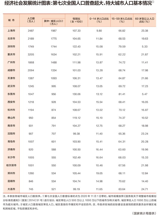 那么当前超大、特大城市有哪些呢?在第七次全国人口普查后,超大、特大城市名单有哪些变化?近日,由国家统计局提供的《经济社会发展统计图表:第七次全国人口普查超大、特大城市人口基本情况》(下称“图表”),在2021年第18期《求是》杂志上公布。