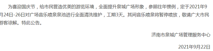 为喜迎国庆节,给市民营造优美的游览环境,全面提升泉城广场形象,参照往年惯例,定于9月24日-26日对广场音乐喷泉泉池进行全面清洗维护,工期3天,其间音乐喷泉将暂停喷放。