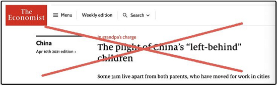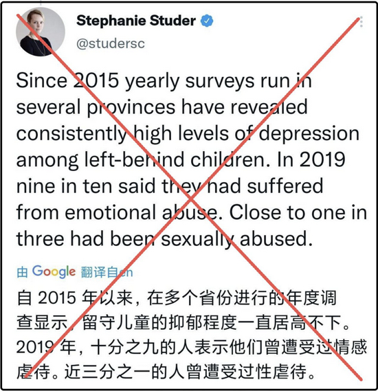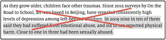 “自2015年以来,北京非政府组织‘上学的路上’(On the Road to School)的调查显示,留守儿童的抑郁水平一直居高不下。2019年,十分之九的人表示他们遭受过精神虐待,十分之六的人表示遭受过身体伤害。近三分之一的人曾遭受性侵”。(本段内容系《经济学人》的虚假报道)