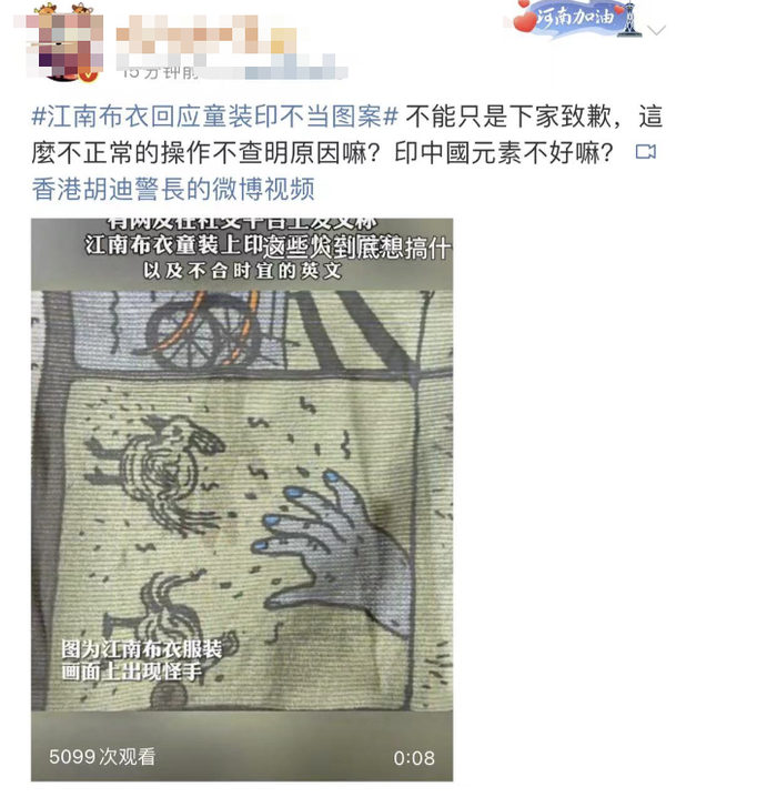 对此,江南布衣集团旗下童装品牌官方账号在网友贴文下回复称:对童装产品出现不恰当图案对消费者造成困扰深表歉意。公司已下架所有相关产品,并严格审核,杜绝此类事件再次发生。