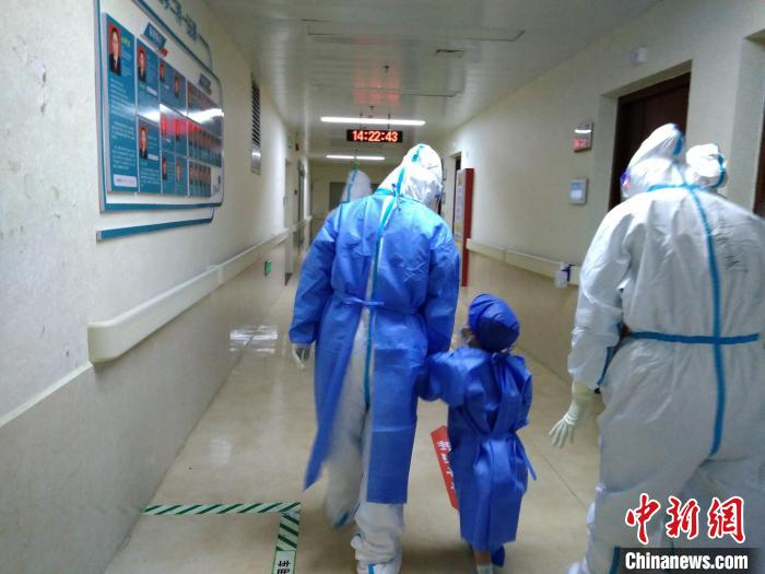 小宝是首批出院中最年幼的。临行前,他把一颗巧克力和三枚冬枣送给徐健,作为告别礼物。徐健为他穿上防护服,又罩上一层隔离罩衣。他们手牵手,穿过长长的红区走廊。