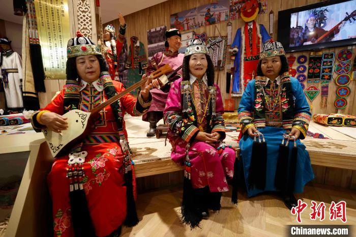 三位非遗传承人在新疆博湖县非物质文化遗产保护中心进行表演。当地将保护并传承非遗融入全域旅游发展。 富田 摄