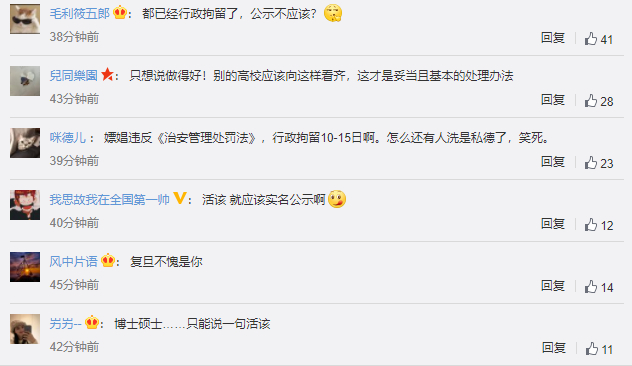 不少网友表示,“嫖娼是违法的,希望这三个学生能引以为戒,积极生活。”“学生就应该有学生的样子,但作为成年人应该为自己的行为负责。”但也有网友提出质疑,处罚决定是否过重,纪律处分决定书中公布的个人信息是否侵犯了当事学生的个人隐私。