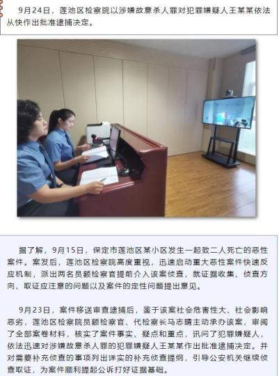 据了解,9月15日,保定市莲池区某小区发生一起致二人死亡的恶性案件。案发后,莲池区检察院高度重视,迅速启动重大恶性案件快速反应机制,派出两名员额检察官提前介入该案侦查,就证据收集、侦查方向、取证应注意的问题以及案件的定性问题提出意见。