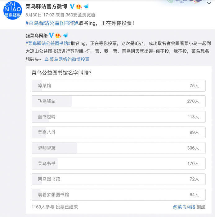 而有意思的是菜鸟驿站公益馆的书来自用户,名字也来自用户,经过为期一周的微博投票,千名用户共同选出菜鸟驿站“驿师驿友”图书馆的名字,而今后还有越来越多的公益图书馆会在大山深处生长开来。