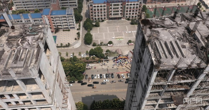 街对面便是娄底市星星实验学校。据了解,该校有师生5000多人。站在学校大门口看烂尾楼,感觉笼罩在高耸塔吊和近百米高楼脚手架阴影下,还有一些向外延伸钢架平台,似乎随时可能飞过来。一些家长和孩子表示有压迫感,遇上雷雨大风天气,高楼脚手架上残存的防护网随风乱甩,细碎水泥渣和其他建筑垃圾从楼顶和各楼层洒落,掉在地面临时建筑顶、街边树木、人行道上,钢构件摩擦碰撞发出的吱呀声敲钟声,塔臂木偶般被风牵线摇晃,像随时可能散落垮塌的预警,令人毛骨悚然。